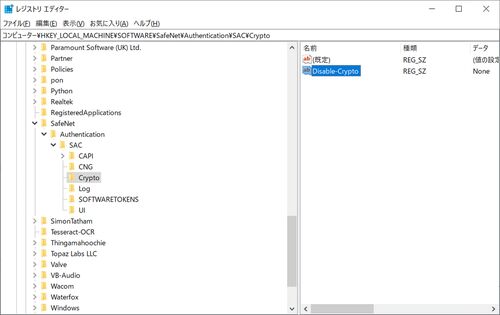 レジストリをいじります。 HKEY_LOCAL_MACHINE\SOFTWARE\SafeNet\Authentication\SAC\へ移動 キー追加で"Crypto" 文字列値を追加して"Disable-Crypto" 値を"None"にする PC再起動 マクロ署名についてはマイクロソフト社のおかしなダブルスタンダードのせいで…